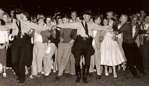 Presley’s controversial show in Vancouver, B.C., on Labor Day weekend in 1957 resulted in a strong backlash from city officials. The crowd in Empire Stadium on August 31 was the second largest crowd Elvis had faced to that point. When thousands spilled out on the field and advanced toward the stage, overwhelming the police officers trying to hold them back, Colonel Parker decided to end the concert early. Vancouver Province columnist Hugh Watson reported Elvis’ response to the Vancouver crowd: “Without doubt this was the worst audience I ever played to. Only my first time in Chicago would compare with it. I’d heard that Canadians were a little more rational. Still, they seemed to like it.” (Below: Elvis crowd in Vancouver, B.C., August 31, 1957)