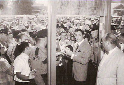 Saturday, September 8, was the fourth day of location shooting for Elvis in Seattle. Dick Moody of the Times characterized Elvis’ activities that day as follows. “Through the glazed eyes of his teen-age fans, Elvis Presley blazed a glittering path like a glowing comet across the World’s Fair grounds … It was a stardust trail of swooning girls, stepped-on feet and harried policemen … Girls laughingly assaulted the police who locked arms to keep the crowds from the singer.”